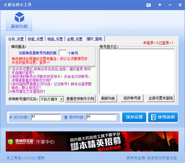 大唐无双小工具是热火游戏《大唐无双》的一款小工具。它可以自动帮助玩家完成帮会任务和循环副本,还支持自动释放功能和循环登录。快点下载,解放你的双手吧。