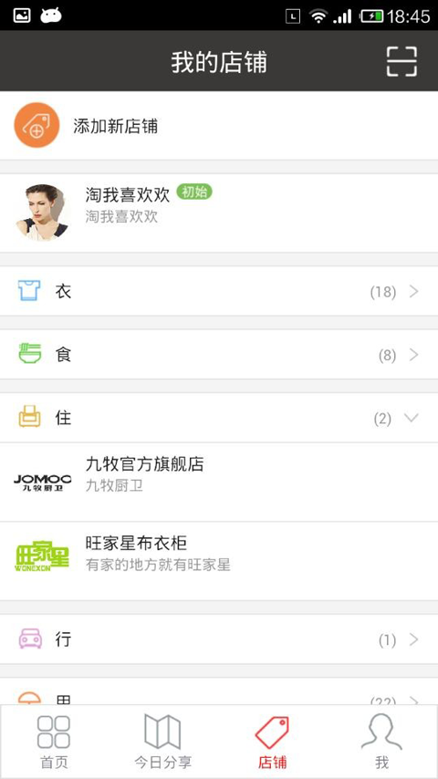 2、加入的店铺自动划分为衣食住行用几种类型,查找管理小店更加快捷简单;