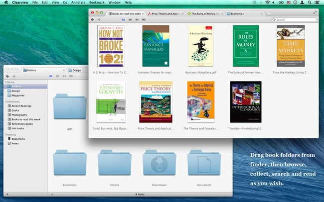 只需把存放图书文件的文件夹从 Finder 中拖拽到 Clearview 的书架,图书文件信息将被迅速导入,然后您就可以方便地浏览,搜索,组织,和阅读图书了。通过图书文件夹和阅读列表结合的方式来管理图书,一切都变得简单起来。