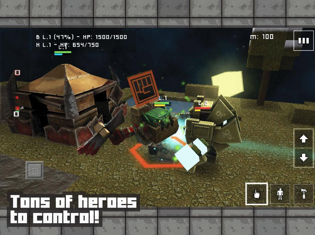 沙盒堡垒战争游戏画面风格依旧,复古的像素风格,在人物与场景上全部是方方造型,英雄、士兵、炮塔、地图的构造全部由正方成组成。对于画面党来说估计会有些失望,但游戏借助了沙盒游戏的魅力,就算是对画面反感也要尝试一下。音效方面制作不错,各种枪炮都很带感,配合背景音乐使得战场气息十足。玩法上也是大家熟悉的模式,先是占领资源,然后建造防御系统,接着控制英雄带来士兵获得胜利。界面右下方是控制选项,第一个是选择英雄和全部的士兵,利用这个可以让士兵和你一起攻击一个目标;第二个是单独的选择英雄;第三个是建造防御设施与炮塔。在这三个选项的左边是英雄当前可用的辅助道具以及近战/远程攻击的切换。看起来有些复杂,不过在实际操作中还是很简单的,比较不会一次全部使用到。