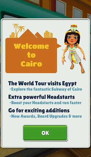 地铁跑酷小游戏有大惊喜开罗更新,新滑板,和两个加入功能的旧滑板,一个弹跳一个加速,效果和原来的一样。游戏中的场景有左右两边,左边是比较具有特色的土房子加陶瓷罐子,而右边的房子也是非常棒。