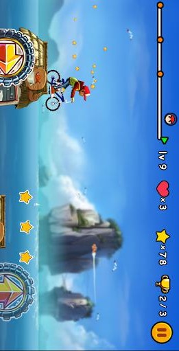 操作十分简单,只需要在看到障碍物的时候触摸屏幕就可以跳起来了。当然撞上后游戏就结束了,骑得越远得分越多。在游戏中我们要控制好这位赛车手,保证他跨越障碍,而且与此同时我们还要注意收集沿途的道具。