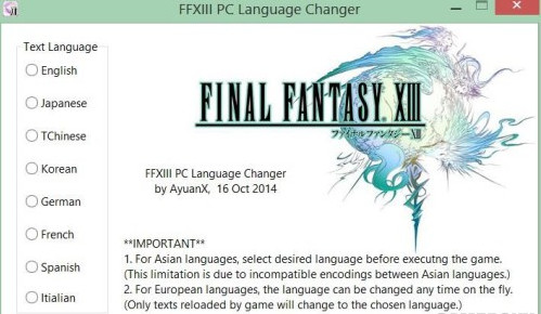 1. 如果想选择亚洲语言,必须先运行语言选择器并选定好语言,然后再启动游戏。如果中途改成另一种亚洲语言会显示乱码,但中途改成其他欧洲语言则无问题。(该限制是由于亚洲语言的代码页互不兼容。)2. 如果想选择欧洲语言,随时可以改语言,立即生效(如果游戏启动后才改变语言,只对语言改变之后才载入内存的文字有效。如果想对游戏中的所有文字都有效,仍需使用先启动语言选择器并选择语言,再启动游戏的方法。)