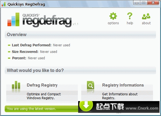 Quicksys RegDefrag是一个免费的注册表碎片整理工具。它能分析注册表的无用键值,碎片和浪费的空间,优化注册表。支持Windows NT/2000/2003/2008/XP/Vista,免费!