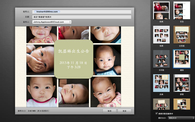 除了将照片直接共享到 Facebook、Flickr、Twitter 和“Message”外,iPhoto 也可与iCloud搭配使用,可让iOS设备上拍摄的照片自动出现在iPhoto中,并且您可以使用“iCloud 照片共享”与家人及朋友分享所选照片和视频。您甚至能够轻松快捷地创建专业品质的相册、日历和凸版印刷卡片。
