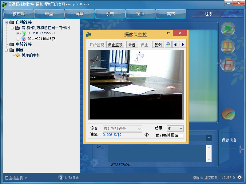 3.摄像头监控:可同时选择多个或单个被控端视频设备来进行实时监控或图像捕捉、录像。