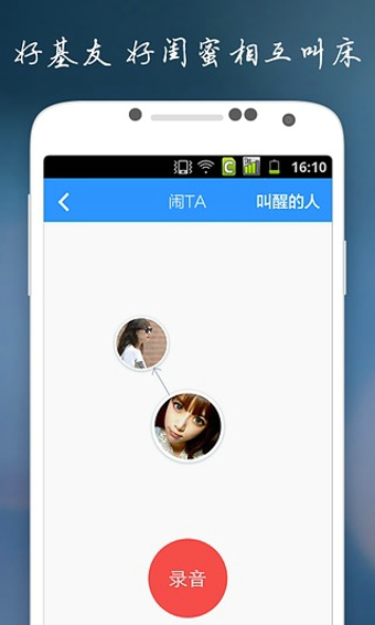 你希望每天都在TA熟悉的声音中醒来吗?你希望TA每天醒来听到的第一个声音来自你吗?只要点击对方头像——打开“闹ta”按钮——为对方录制专门的闹铃,轻松实现情侣之间、家人之间、闺蜜之间、基友之间、同学之间的互助起床,有趣更有爱。
