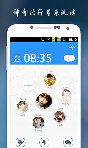 选择随机女生/男生喊你起床,那么,将有一个神秘女神(男神)叫你起床。选择随机闹铃,你永远不知道下一个叫醒你的是女汉子、萌妹子,女神还是女神经病。以起床之名,让生活多一点期待,多一点惊喜。