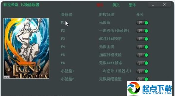 降世神通科拉传奇修改器是《降世神通科拉传奇》的八项修改器。它可以做出无限血、一击必杀、战斗时间锁定、无限金钱、加速升级技能、还有无限BUFF状态和无限觉醒能量等快捷键的设置。并且功能也很强大。