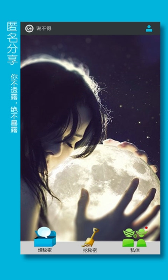 说不得安卓版是2014最火爆最好玩的游戏交友软件,匿名分享秘密的私密交友应用。来说不得,可以把自己的秘密、吐槽藏在宝箱里埋起来;可以玩游戏,挖陌生人秘密;让有缘分的陌生人主动找你聊天、交友。
