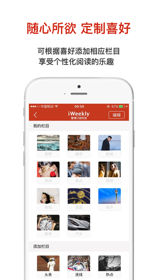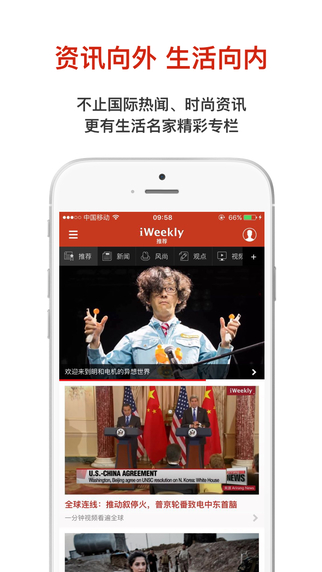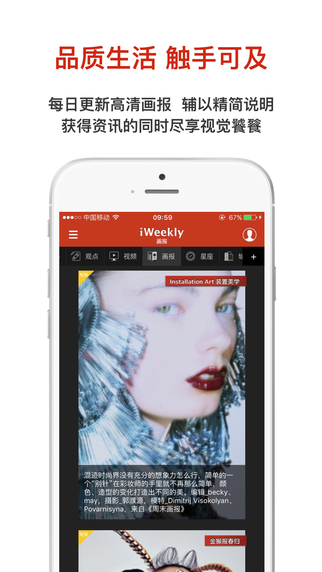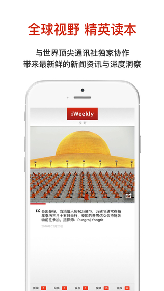 周末画报iPhone版简洁明快,新闻时尚等并存,对了解世界,开拓自己的见闻很有用,跟着周末画报的节奏一起感受时尚的潮流,体验小资的情调。2010年推出,中国原创世界公民行动读本,新闻及生活类APP典范。专为中国精英社区群体打造的掌上读本,结合指尖出众互动,美感设计,精致新媒体资讯跃然欲出,致力于为你提供全球视野的报道及时尚资讯,让你时刻领先移动互联网潮流。每日奉上环球视野、全球连线、智趣观点、时尚风潮、城市发现等精美的图片、图文、视频、音频内容。提供中国精英以全球视野。