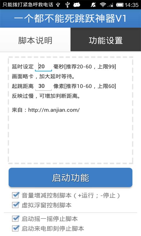 一个都不能死跳跃神器V1下载 v1.0 安卓版 一个都不能死辅助可以帮助玩家在普通模式实现全自动跳跃,解放玩家的双手,轻松一下。这款辅助可以称它为一个都不能死跳跃神器,只要脚本开启后开始游戏就可以自动跳跃刷分,又快升的又高。