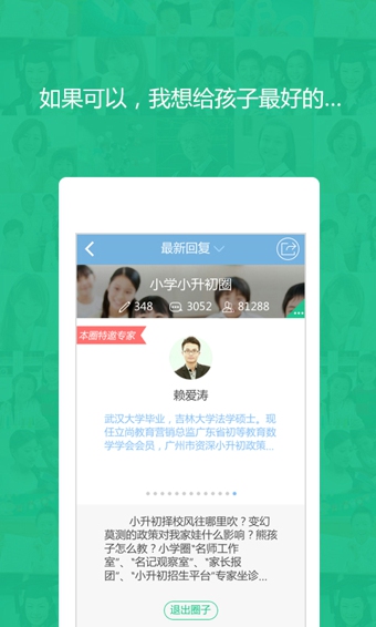 权威:小升初、中考、高考、自主招生、家庭教育,权威教育专家坐镇不同圈子,为你提供专业的升学攻略及政策解读,助你快人一步。贴心:青春期教育、喜怒哀乐家长心事,有人倾诉有人聆听,更有教育专家与你零距离沟通,助你成为更好的家长。