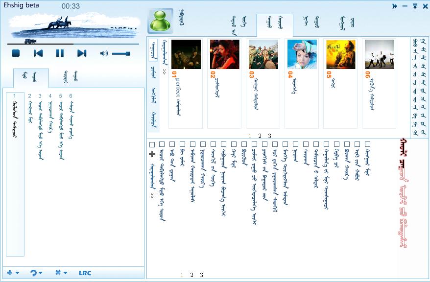 蒙古文播放器ehshig已经开始公测,有很多蒙古歌曲,可以分享歌曲以及感想..这里有几千首蒙文歌曲,有桌面歌词;有同步歌词;可以登陆注册;可以编辑歌词;可以听本地歌曲网络歌曲等等。Ehshig 蒙文音乐播放器,类似于搜狗音乐播放器。歌词需要安装字体,否则是乱码。我的直接歌词就出来了,没安装别的什么呀!这个根本就不是以字体的模式出现的,是flash!【使用评测】