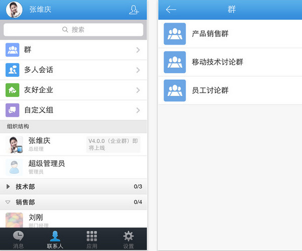 1)支持显示本企业组织结构、友好企业和自定义组;2)支持友好企业查找及添加功能;