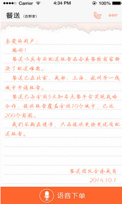 6、系统消息,语音下单后,系统会迅速将您的呼叫推送给离您最近的餐送员,系统即时推送订单最新状态,实现全程跟踪。