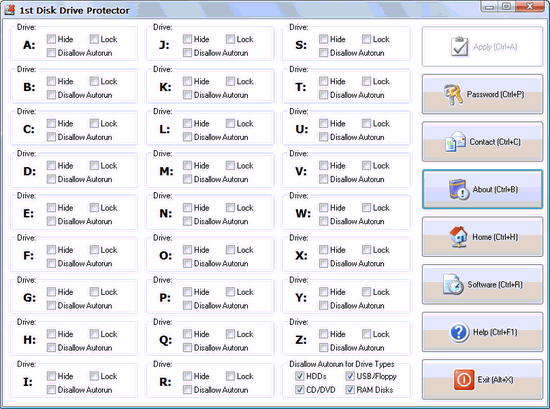 1st disk drive protector 能保护你的计算机免受移动存储器滥用的危害,它能设定用户是否可以使用移动存储器或访问本地硬盘。你不仅可以隐藏、加锁来防止本地硬盘、usb、软驱和网络的被滥用,还可以禁止自动运行功能,减少未授权程序带来的风险.