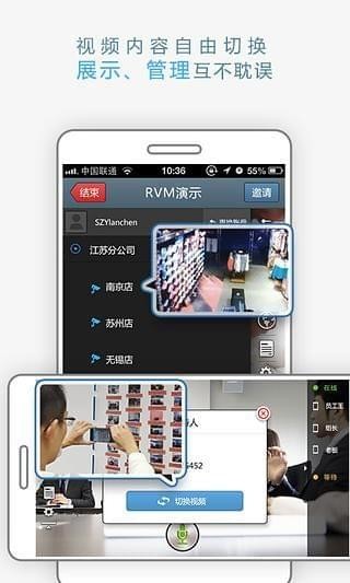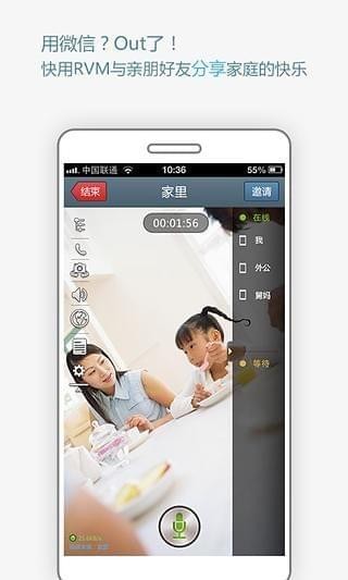 1. 海量免费通话时长,告别运营商套餐包月的多余支出每一台手机都可以上网,能上网就能使用RVM进行可视管理,当您要邀请的同事或好友没有安装RVM时,可以采用落地电话方式直呼对方,对方只要接听电话就能够加入沟通讨论。现在注册赠送海量通话时长哦~2. 无缝集成你的通讯录 RVM的好友就是你手机通讯录中的联系人,用RVM可以直接给通讯录中的人发短信或者打电话,完全无缝集成。
