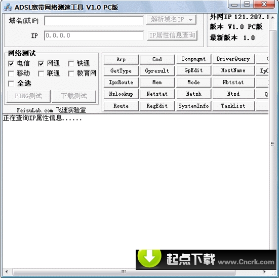 ADSL宽带网络测速工具 V1.0 简体中文绿色免费版 ADSL宽带网络测速工具是一款集合域名查询、IP属性查询的网络测速工具,支持域名解析、IP属性查询、拥有大量网管快捷操作方式,提供支持ICMP和HTTP协议的电信测速、网通测速、铁通测速、移动测速、联通测速、教育网测速,是网络检查的好工具
