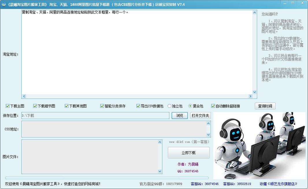 图片分类下载、主图下载、属性图下载、宝贝详情页图片下载、数据包制作、图片搬家功能将宝贝中的图片自动搬家到您自己的图片空间,在也不用为使用他人空间相片的提示而烦恼.只需输入任意店铺的任意商品网址连接到工具就可以智能下载图片和生成CSV数据包,然后将商品CSV数据包导入淘宝助理就可以上传到自己的店铺啦!【使用方法】