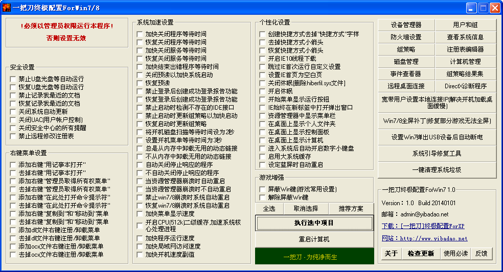 本软件需要管理员权限对系统进行优化配置,默认启动时会申请管理员权限。这并不能保证在任何系统的任何状态下都会生效,如果你发现配置无效,请以管理员权限运行本程序。