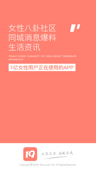 19楼(www.19Lou.com),中国最大的致力于为用户提供便捷的生活交流空间和体贴的本地生活服务。你可以随时和志趣相投的网友讨论热点新闻、情感故事、聊八卦、相亲交友、结婚、育儿、装修图库、小说、美妆养颜、私房菜谱、去旅游、找房子、找工作、学习时尚搭配、汽车、玩摄影、秀宠物、理财等生活话题,并可以获得网友真诚的帮助。从2006年起,19楼相继在杭州、台州、嘉兴、宁波、绍兴、湖州、温州、金华、上海、福州、泉州、重庆、郑州等城市,成功发展了活跃的本地生活社区,19楼已经成为全国覆盖最广、渗透最深的城市社区,网站影响一亿多用户。