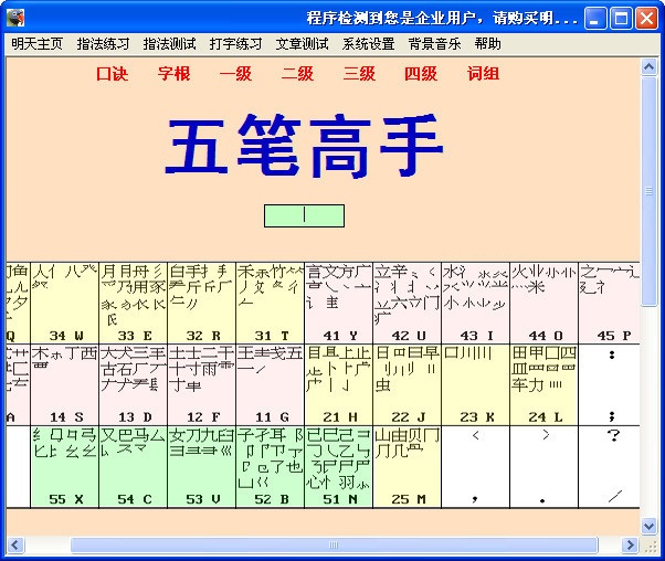 1、指法:动画教学,标准盲打指法提示;2、打字练习:提供速成教程,不用再看书本;3、文章测试:词组动态提示,见词打词,不成词组才打单个汉字;4、练习F1、测试F2键盘图动态提示。