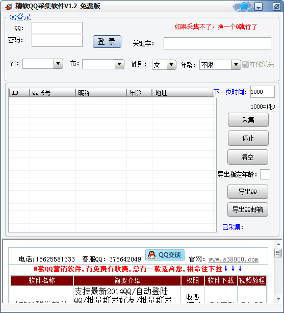 1:在线优先采集2:精确到省份,地区3:精确到年龄,姓别4:关键字采集5:支持导出邮箱,QQ号6:所有采集的数据都是在线采集,腾讯QQ在线的数据
