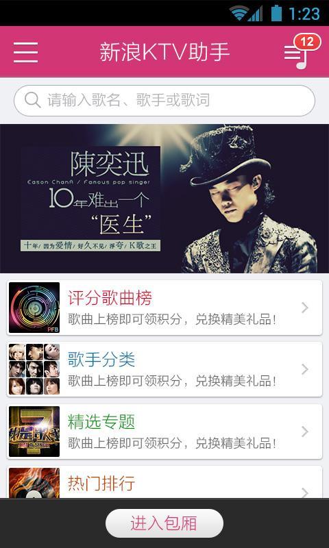 通过扫描包厢二维码或者直接填写包厢口令,即可进入包厢。进入包厢的手机用户可以在手机端直 接点歌,与包厢同步。