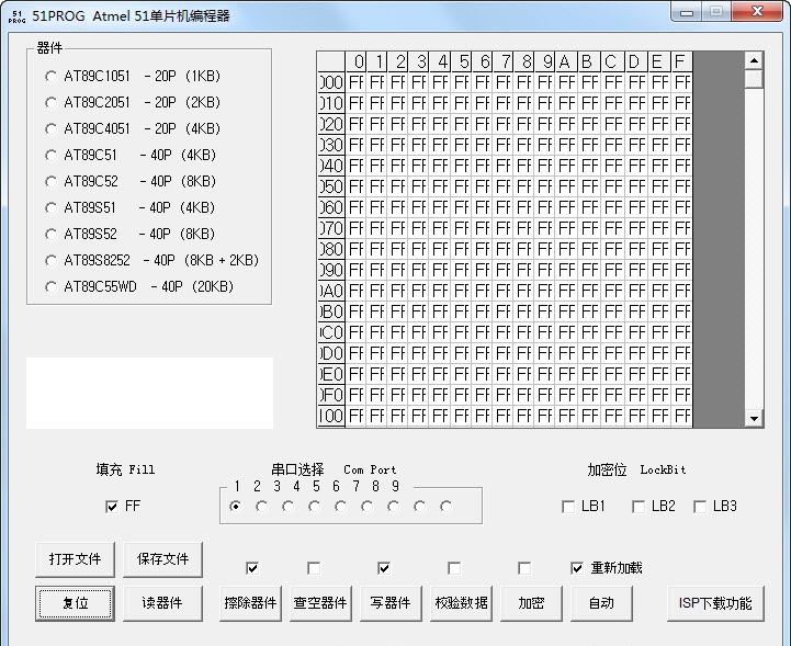 1、程序运行,请先选择所用的虚拟串口号,再选择所用的器件,可以按“复位”,编程器将自动识别。
