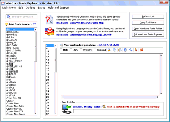 Windows Fonts Explorer 是一款免费而小巧的字体预览工具,它可以帮助您浏览 Windows 中已安装的字体,并可使用多种效果,例如粗体、斜体、下划线、删除线等。不需要安装任何其他软件,非常简单而快速!