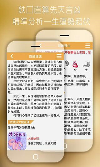 功能特点:国内着名命理老师亲自指导,最简洁易用的八字排盘应用。免费看排盘,提供八字干支、十神、五行、藏干、纳音、日主旺衰、大运年等专业命理信息。大运年表、流年运程为您分析一生运程起伏,流年趋吉避凶。十神、命宫详解让您知晓先天运势、命运的主轴、行运的源头。性格、事业、健康、婚配分析全面独到,精确预测您人生的贫贱富贵,让您更了解自己。转运方法,方方面面、随时随地避煞转运。