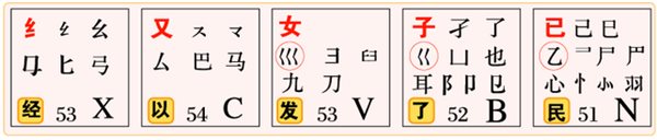 c.注意上图中每键位里红色圈中部分:一横两横三横;一竖两竖三竖四竖……,一一记住它。