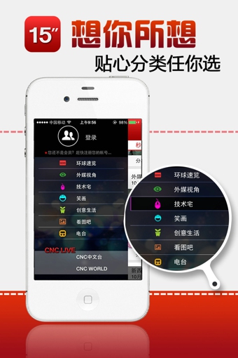 15秒是新华社新华网络电视推出的首款超短新闻视频客户端,以短视频化的新闻资讯为主,以15秒的黄金时长和全球视角和轻松的表现形式,及时、权威地报道国内外最有价值的重要新闻;CNC中文台、CNCWORLD两个直播频道,24小时直击天下大事,全方位、多角度、深入权威解析时事热点。