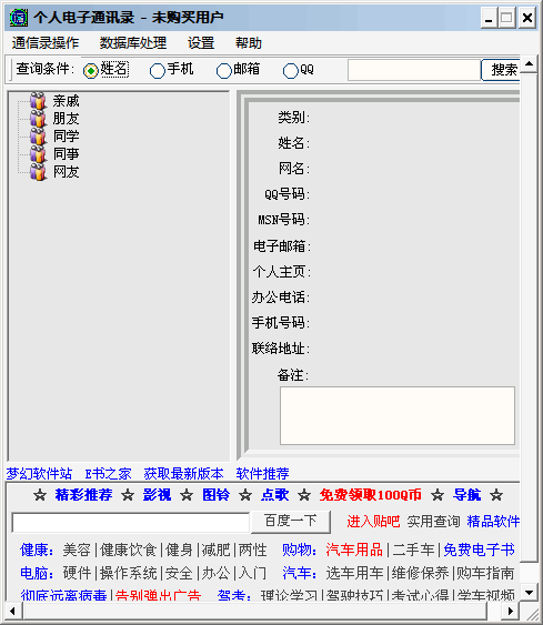 一款功能实用,设计精巧,风格别致,界面优美的个人信息管理软件。可用于存储大量的个人通讯联系信息,并可执行分类管理。而且在操作上非常简便,您不妨下载试试