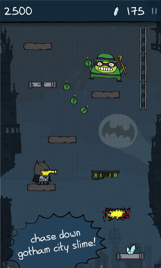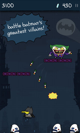 《涂鸦跳跃之DC超级英雄Doodle Jump DC Super Heroes》是一款非常有趣的休闲游戏,这是《涂鸦跳跃》的新续作,在游戏中玩家需操控打扮成蝙蝠侠的小Doodle战胜蝙蝠侠曾对战的几个经典坏蛋,包括企鹅人、急冻人、小丑等等。而游戏中这位弹跳小人最爱的火箭筒、弹跳装置、磁铁等等道具都穿上了蝙蝠式的新装。