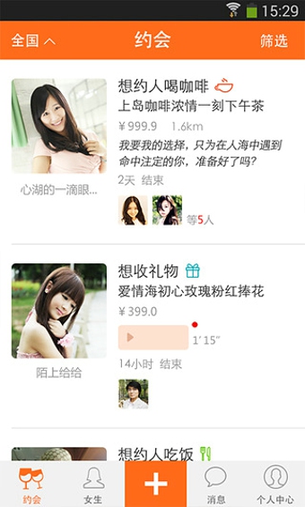 求约会官方精选吃饭、电影、咖啡、礼物等约会内容,安全见面,快速约会!男生先买单,女生全免费,精选心意好礼,零食、玩偶、包包、文具、鲜花、巧克力、小家电…丰富好礼全场包邮,女生地址是绝密,安全拆礼到手软!