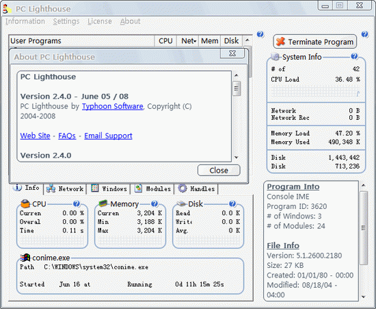 PC Lighthouse 是一个功能强大的任务管理器, 压缩后仅有87Kb, 它可以轻松地结束正在运行的程序, 并查看当前程序使用的组件等详细信息, 高亮的图形可以清楚地反映内存、CPU 的使用状况, 它还可以随系统启动, 就在今天换掉单一的任务管理器吧.