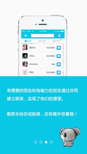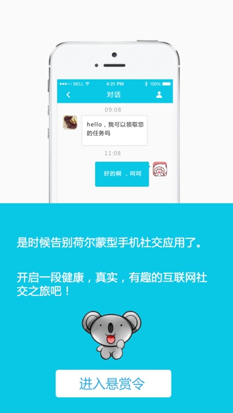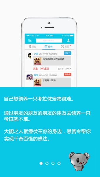 自己想领养一只考拉做宠物,很难,大能之人就潜伏在你的身边,悬赏令帮你实现千奇百怪的想法。 你深藏独门技能却苦于没有展示的舞台?悬赏令给你一鸣惊人的机会,让你的朋友对你刮目相看。 有需要的朋友和有能力的朋友通过你而建立联系,实现了他们的愿望,悬赏令给你成就感,还有意外惊喜哦! 是时候告别荷尔蒙型手机社交应用了,开启一段健康、真实、有趣的互联网社交之旅吧!