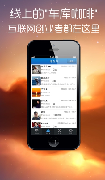 唯一面向互联网创业者,TMT创业者的社交app!如果您已经创业,要安装,如果您想创业, 更应该安装!缘创派(www.ycpai.com)就是创业者的社交工具,线上的车库咖啡。
