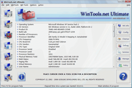 WinTools.net Professional 包括工具:Clean Uninstaller(卸载器)、Scan Files(文件扫描器), Scan Registry(注册表扫描器), Start Up(启动管理), Tweak UI(系统设置), Net Tweaker(网络设置), The Privacy(隐私策略)。