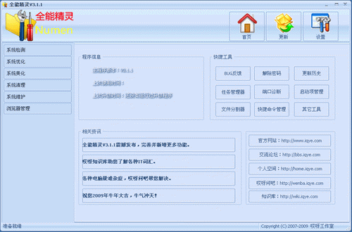 全能精灵是一款系统辅助软件,它提供了硬件检测、系统优化、系统清理、系统美化,IE管理和进程管理六大功能模块及数个附加的工具软件。