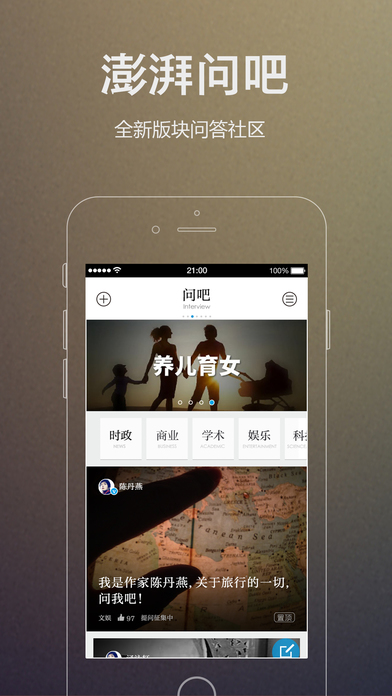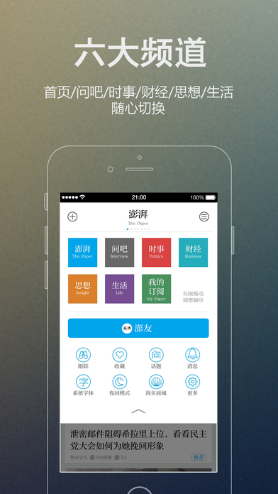 澎湃新闻iPhone版来自上海东方早报旗下的一个新的新闻品牌,澎湃新闻iPhone版专注于时政报道,致力于生产并聚合中文互联网世界最优质的时政思想类内容。关于时政新闻报道作为用户大家可以通过澎湃新闻iPhone版客户端来追问新闻、探讨思想、书写来信或在澎湃开设栏目。澎湃新闻通俗但不庸俗,懂批评也懂建设,听民意但不迎合,谈问题也谈主义。澎湃新闻希望在信息纷杂的时代,让用户之间享有最充分的交流与探讨,由追问洗出真相,由讨论辩出真理,为用户提供真正有价值的信息与见解。