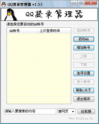 QQ登录管理器 V1.63 简体中文绿色免费版 一个方便的QQ批量登录管理工具,此软件以100多K的小巧体积,实现了QQ密码加密、QQ批量登录等强大的功能。此软件不仅支持QQ的登录管理,也支持TM和QQ游戏的登录管理