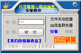 日月精华文件夹加密软件 一款全免费加密软件,他可加密任意格式的文件,或目录,加密后的文件会以exe文件格式保存 并且加密后的软件,可离开软件,独立运行.这样就就可以将你的机密文件,以加密后的格式,进行携带或网络传输,在密码不正确的情况下,他是绝对不会被打开的。