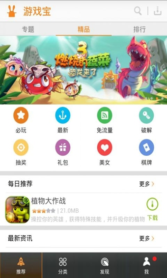 游戏宝下载里面有海量的游戏,最新的游戏资讯,还有和游戏相关的攻略教程,对于喜欢玩游戏的朋友,这款软件可以非常有用的哦,不仅让你淘到最新的安卓游戏,还有游戏指导,让你玩游戏都能玩成神。