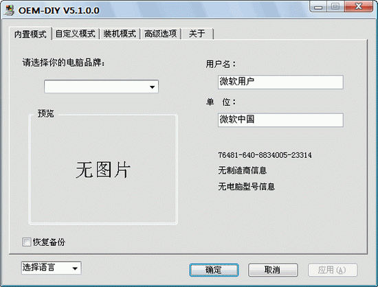 系统破坏后重装系统导致OEM信息丢失了怎么办,用本软件还原吧。不满足于千篇一律的LOGO图怎么办,用本软件自己做一个吧。软件内置31个品牌电脑和18种主流CPU的LOGO图,还可自定义自己的 LOGO,修改用户名和单位名,自定义技术支持信息,改LOGO就是这么简单,下载了试试?绿色软件,解压后直接运行。软件内置的OEM品牌:宏基,华硕,康柏,戴尔,方正,富士,七喜,惠普,IBM,联想,新联想、三星,索尼,TCL,清华同方,东芝、明基、长城、神舟、海信、实达、恒生、八亿时空、蓝星、易纬、海尔、新蓝、京东方、清华紫光、LG、NEC。Intel和AMD的部分流行CPU型号LOGO。