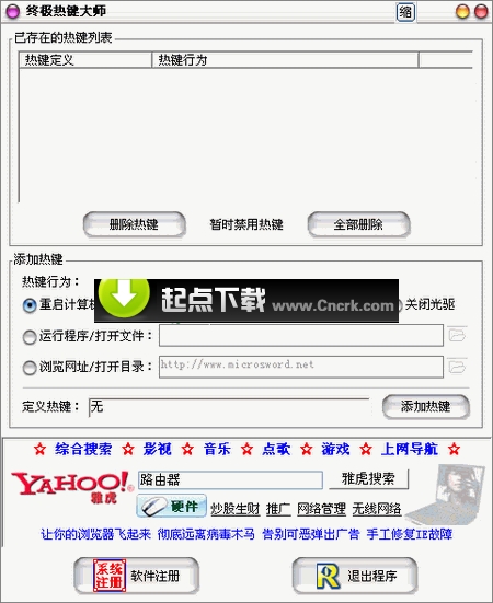终极热键大师是一款优秀的热键辅助工具,她可以让您方便的定义自己的热键。您可以通过自定义热键的方式方便地实现用热键打开指定文件或目录、浏览网址、运行程序、弹出/闭合光驱、重启/关闭系统等操作