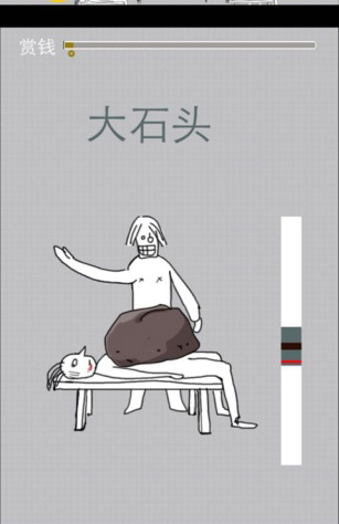 《胸口碎大石》是一款非常搞怪的休闲益智类游戏,进入游戏就会看到两个屌丝,一个躺在凳子上,抱着石头,另一个挥手准备砍下去,你要做的就是控制砍石头的那个人,屏幕右边有一个力量槽,中间的灰色区域是有效区域,在这个区域停下来就是成功的砍碎石头,如果出了这个部分,那就GG了。游戏听上去就像是街头卖艺的,没错!他其实就是一个卖艺的游戏,不过这次劈石头的就是你!喜欢的玩家可以挑战一下自己的反应。【游戏特点】