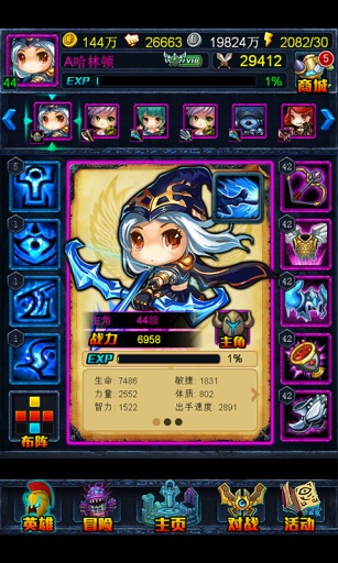 由主界面下方“冒险”按钮进入冒险界面。冒险通关后获得经验、撸币、技能点,还有一定几率获得装备、高级打造材料、珍贵道具,是玩家提升等级和天赋的主要玩法